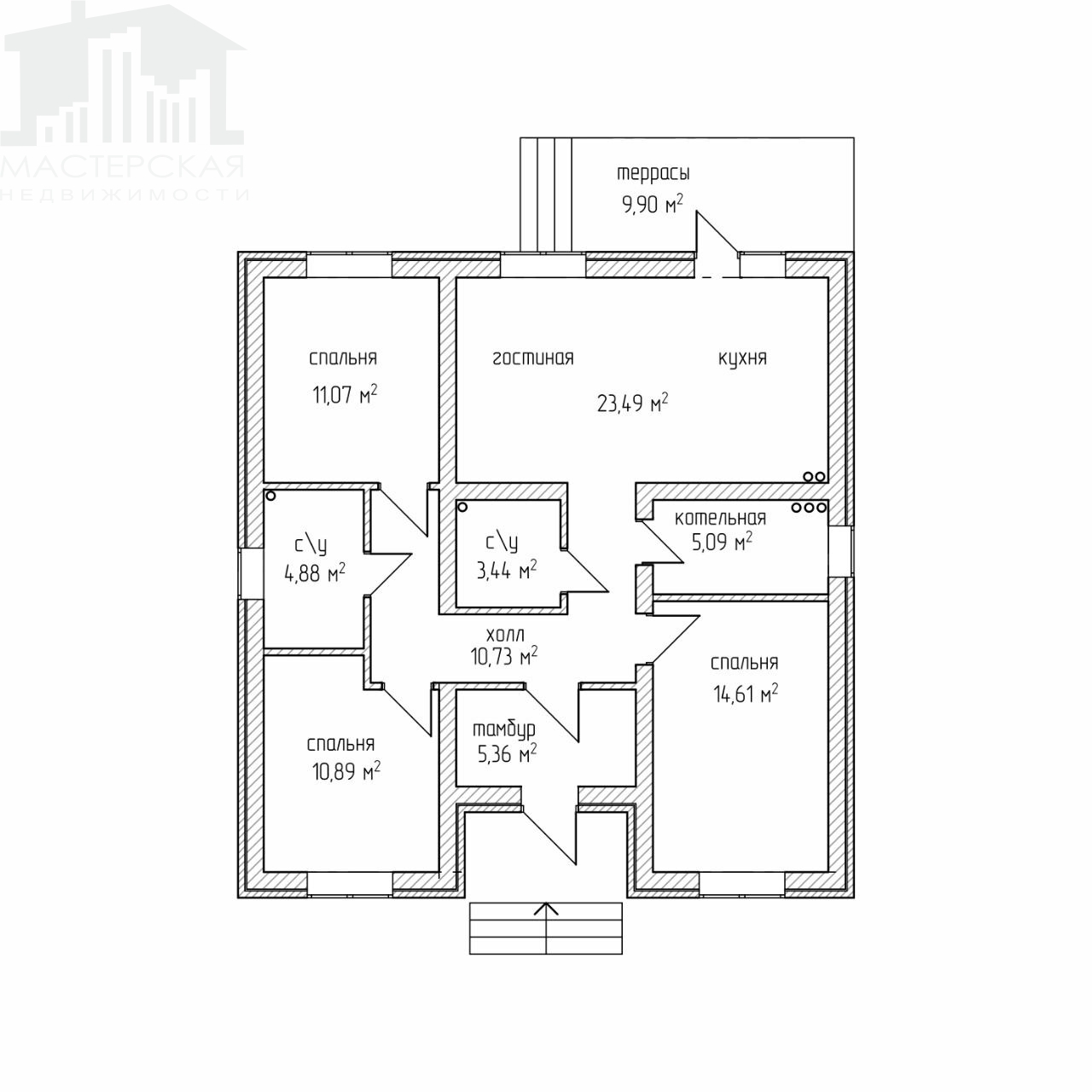 ТАМБУР-ПРИХОЖАЯ 5,36 КВ.М., ХОЛЛ 10,73 КВ.М. ДВА САНУЗЛА, КУХНЯ -ГОСТИНАЯ 23,49 КВ.М. С ВЫХОДОМ НА ТЕРРАССУ (9,,9 КВ.М.), ТРИ СПАЛЬНИ (11 КВ.М., 11 КВ.М., 15 КВ.М.) РАЗНЕСЕНЫ ПО УГЛАМ ДОМА, КОТЕЛЬНАЯ 5 КВ.М.